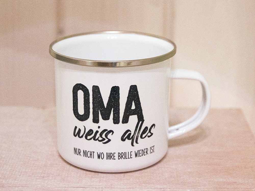 Persönliche Geschenke sind wertvoll. Die trendige Emailletasse mit persönlicher Message an die „Oma“ bereitet besonders lange Freude unterwegs oder zuhause.
